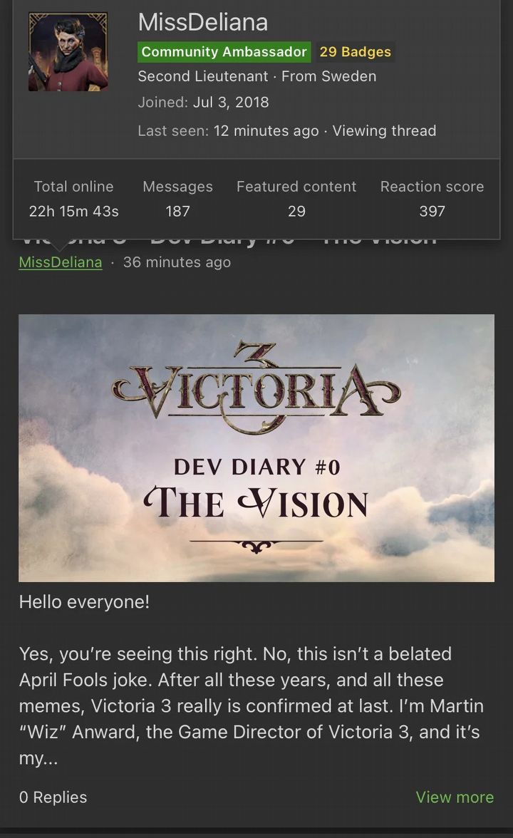 Dziś o godzinie 20:00 czasu polskiego wystartuje wydarzenie PDXCON. Dwa lata temu podczas niego Paradox oficjalnie zapowiedział Crusader Kings III. Co czeka na nas tym razem? Wygląda na to, że wiemy to już teraz. Na forum szwedzkiej firmy przez pomyłkę pojawił się „odcinek zerowy” dziennika deweloperskiego, według którego kolejną jej produkcją będzie Victoria 3. Temat szybko został usunięty, lecz internautom udało się zachować screeny (via ResetEra).