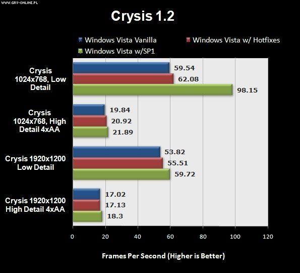 Dowiodły tego badania przeprowadzone przez redakcję ExtremeTech. W stosownym artykule opisała ona dokładnie wyniki osiągnięte w testach zrealizowanych na kilku popularnych pozycjach pecetowych. Z danych opublikowanych w formie wykresów możemy wywnioskować, że największy skok w poprawie wydajności systemu zauważą użytkownicy słabszych konfiguracyjnie komputerów, zmuszeni do zabawy przy aktywowanych niskich detalach otoczenia. Największą różnicę na plus odnotowano w przypadku Crysisa. Instalacja Service Packa 1 pozwala na poprawienie płynności rozgrywki aż o około 40 klatek na sekundę. Na rezultaty nie powinni także narzekać miłośnicy World in Conflict (poprawa o około 20 klatek na sekundę) oraz Company of Heroes (kilkanaście klatek więcej). Jedynie w przypadku Supreme Commander nie widać większej różnicy.