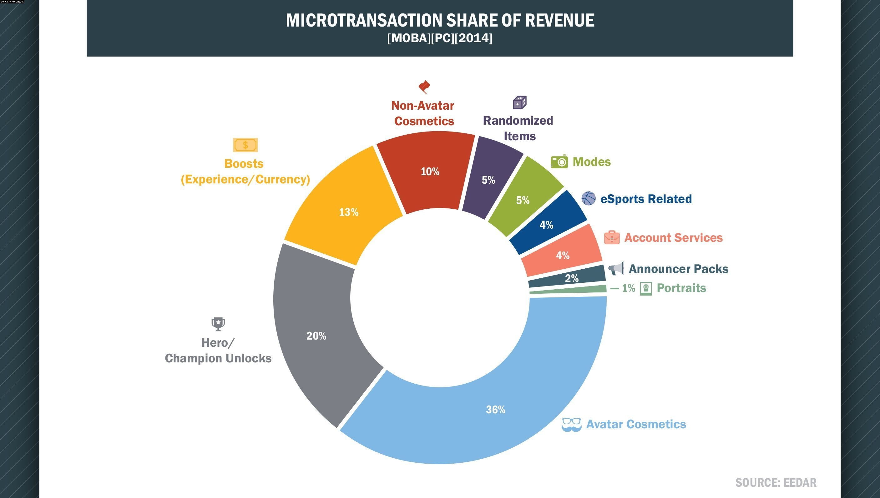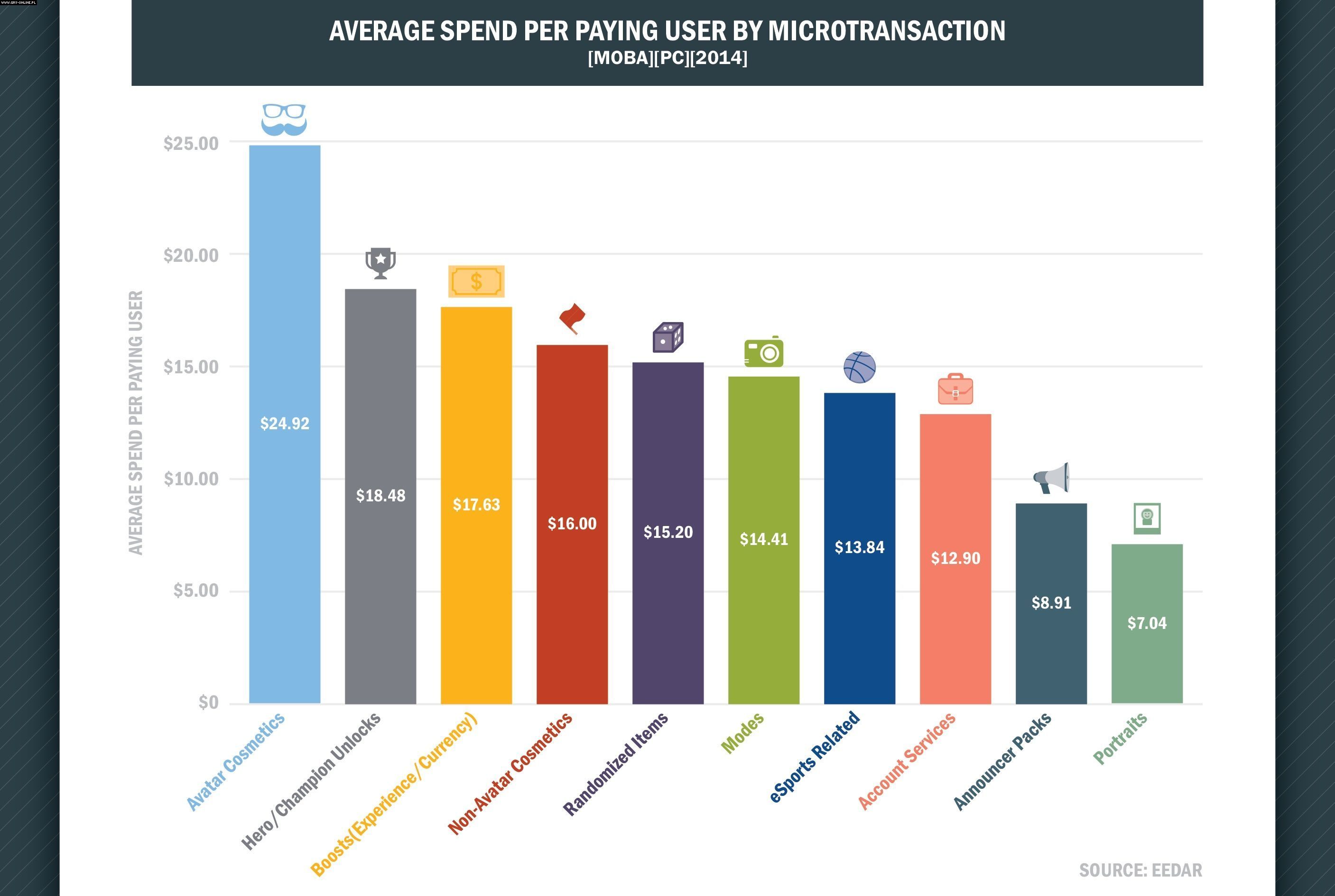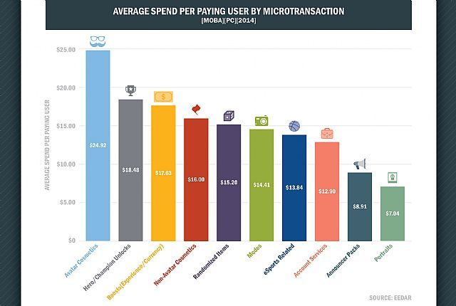 Na poparcie swoich spostrzeżeń autor zamieścił diagram (widoczny powyżej), przedstawiający podział przychodu z mikrotransakcji ze względu na rodzaj kupowanej korzyści. Aż 36% (ok. 180 milionów dolarów) pochodzi z zakupu dodatków zmieniających wygląd postaci. Sporo mniej gracze przeznaczyli na odblokowanie nowych bohaterów (20%) oraz wszelkiego rodzaju bonusów zwiększających zdobywane doświadczenie bądź walutę (13%). To z kolei wynika z pojawiania się wciąż nowych i dość często unikalnych pod względem stylu rozgrywki herosów oraz chęci jak najszybszego rozwinięcia tychże. Identyczne wnioski nasuwają się z diagramu pokazującego średni wydatek gracza na przedmioty z poszczególnych grup (widoczny poniżej): dodatki kosmetyczne dla awatara kosztowały pojedynczego gracza ok. 25 dolarów, nowe postacie ok. 18 dolarów, a „boosty” – nieco poniżej 18 dolarów.