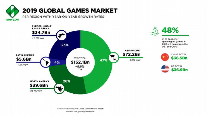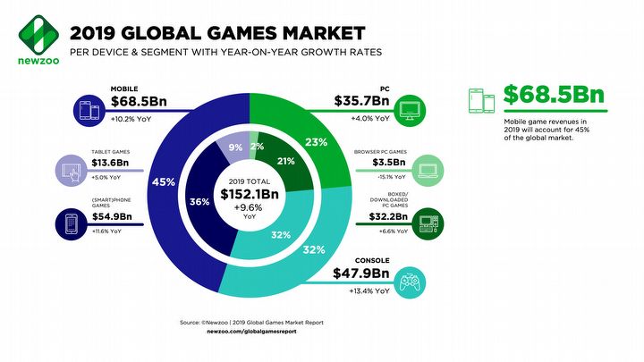 Według raportu przygotowanego przez firmę Newzoo, globalny rynek gier komputerowych wygeneruje w 2019 roku 152,1 miliarda dolarów przychodu, co przełoży się na wzrost na poziomie 9,6% względem roku 2018. Największym kawałkiem tego „tortu” wciąż pozostaje sektor gier mobilnych.