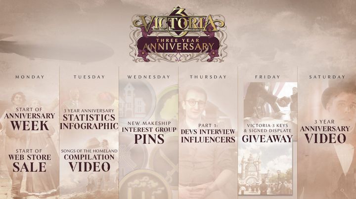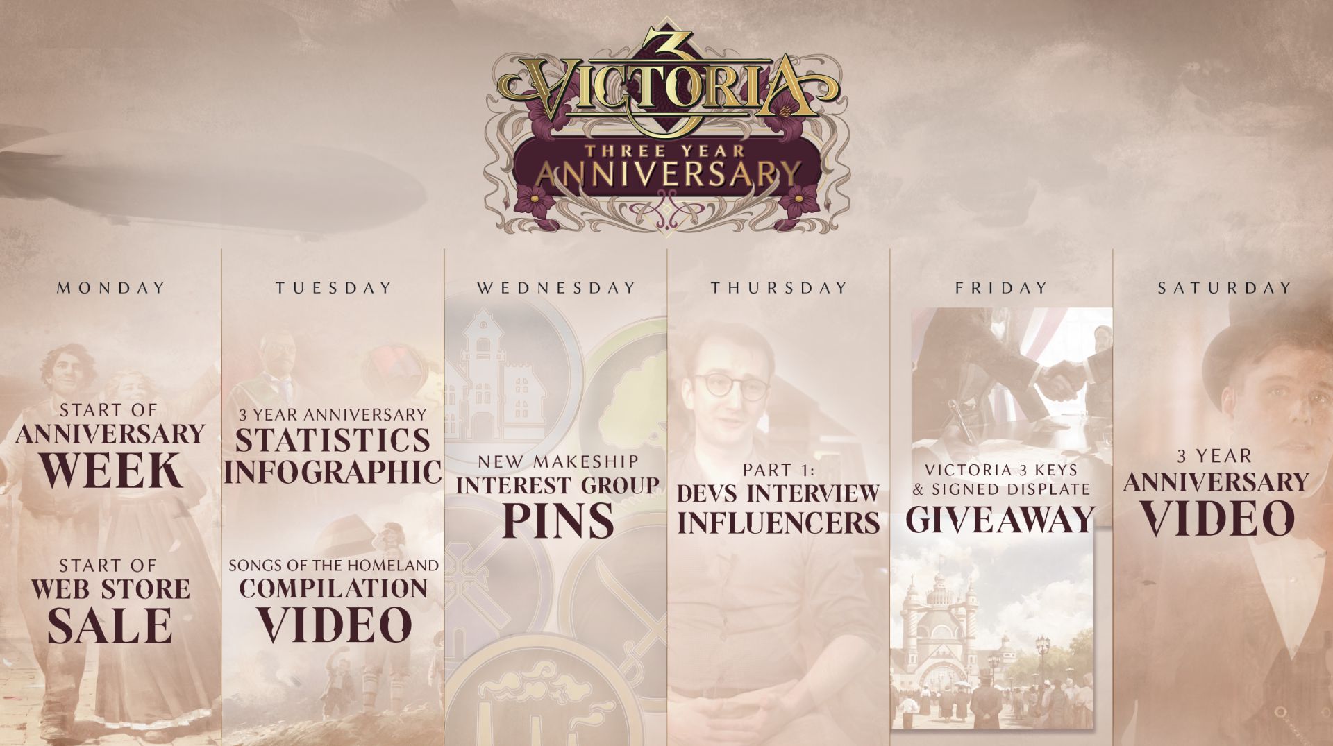 Dokładnie 25 października strategia Victoria 3 będzie mogła pochwalić się kolejną rocznicą premiery, ale jej twórcy nie zamierzają czekać do tej chwili ze świętowaniem. Studio Paradox Interactive planuje celebrować trzecie urodziny swojego dzieła niemal przez cały tydzień, od poniedziałku aż do soboty, udostępniając kolejne atrakcje związane z grą.