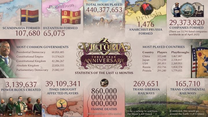Twórcy świętują trzecią rocznicę premiery strategii Victoria 3 i podzielili się imponującymi statystykami. Tylko w ostatnim roku fani spędzili przy grze ponad 440 milionów godzin.