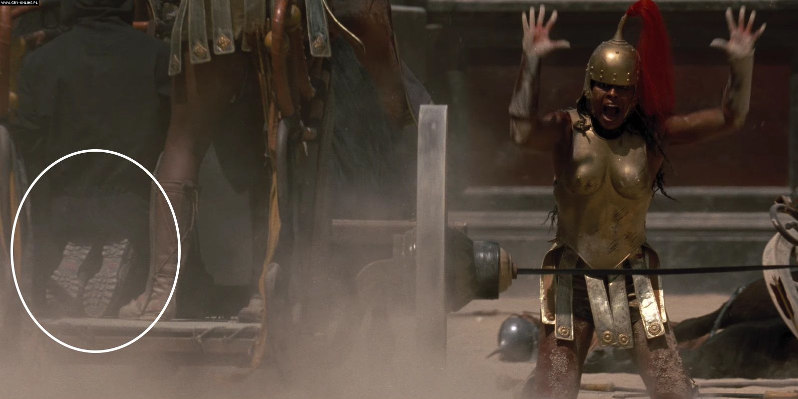 Mowa tutaj o widowiskowej scenie, podczas której Maximus wraz ze swoimi kompanami walczą na arenie z barbarzyńcami z Kartaginy. Pomimo dużej dozy akcji i krwi, która pojawia się na ekranie, wprawne oko może zauważyć pewien niepasujący szczegół po zatrzymaniu filmu w odpowiednim momencie. Po upływie 1 godziny, 26 minut i 24 sekund na ekranie widzowie mogą dostrzec współczesne buty, które należą do jednego z techników.