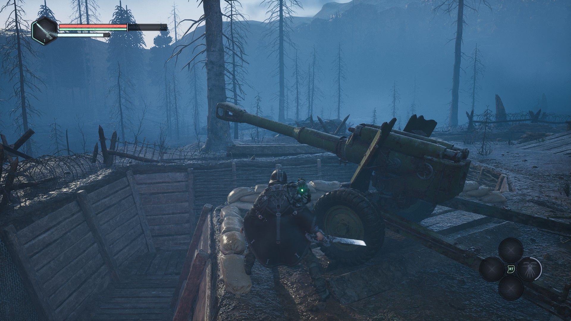 Tak czy inaczej, ta klamra kompozycyjna sugeruje, że większość gry będzie retrospekcją (mam nadzieję, że zostanie to przełamane, bo forma przesłuchania trochę wybija z akcji, a w praktyce – z tego pieczołowicie budowanego przez twórców poczucia niesamowitości). Remi w każdym razie próbuje wrócić w swoje zniszczone, rodzinne strony, gdzie trwa wojna, żołnierze patrolują drogi, a jakby tego było mało, po ruinach i polach paradują sobie potwory wyjęte żywcem z grafik Beksińskiego (tak, przy Tainted Grailu też użyłem tego porównania, ale co ja poradzę, że sznyt Beksińskiego mocno wrył się w popkulturę i jest efektywny?).
