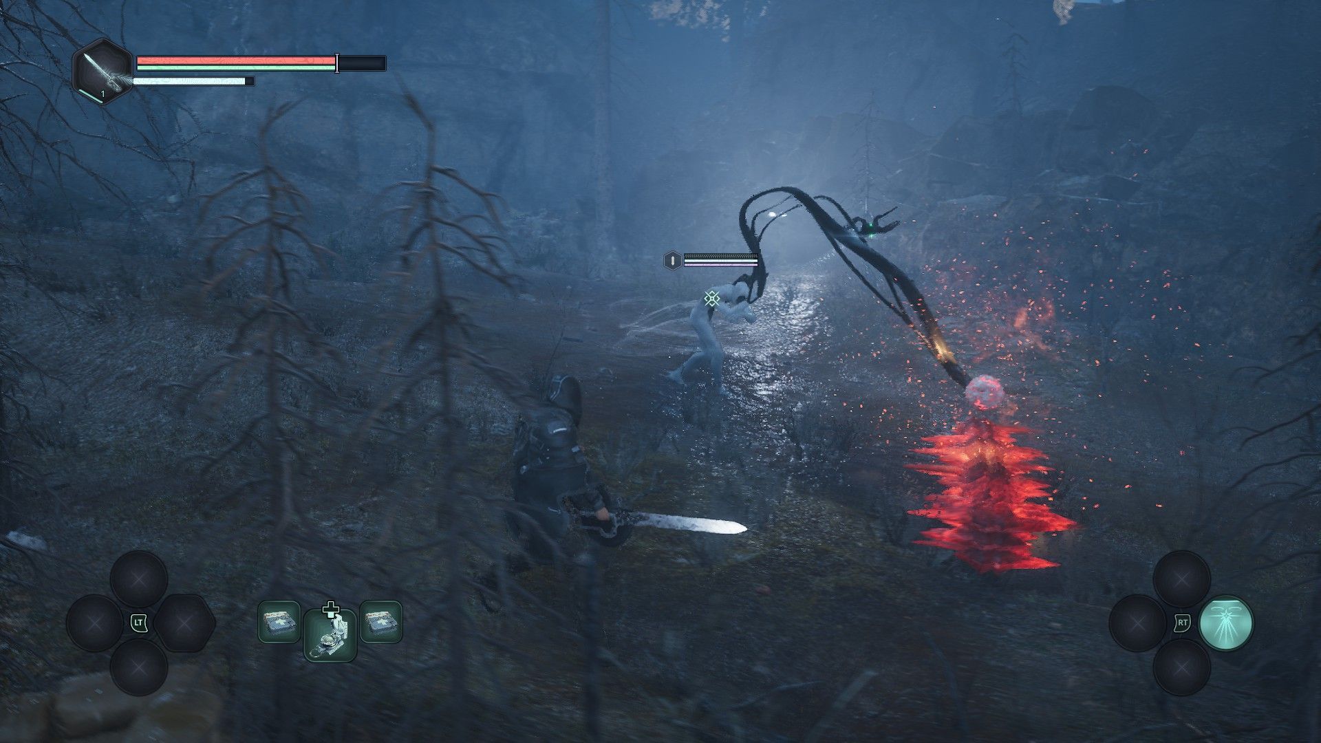 Podstawowa różnica – tu sami sobie regulujemy poziom trudności (grałem na „normalnym”, trzecim z pięciu – oferuje całkiem zbalansowane wyzwanie, przynajmniej póki co). Nie znajdziemy też ognisk, a zwykłe save pointy. Nie korzystamy z odnawialnych estusów, tylko polujemy na jednorazowe środki medyczne. Nie zbieramy dusz (ani run), którymi rozwijalibyśmy postać. Zresztą nie uświadczycie tutaj rozwoju postaci jako takiego, występują tu jedynie ulepszenia broni – jak na razie proste i logiczne, oparte na tym, jak często korzystamy z żelastwa (w moim wypadku był to miecz i topór), do których z czasem dokładamy specjalne tokeny ze wzmocnieniami.