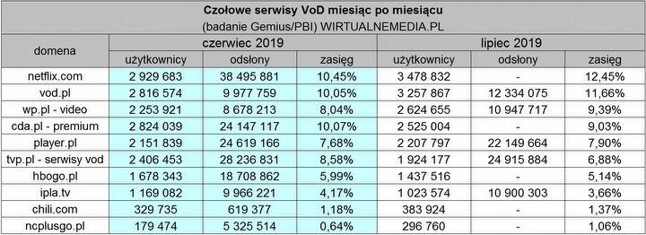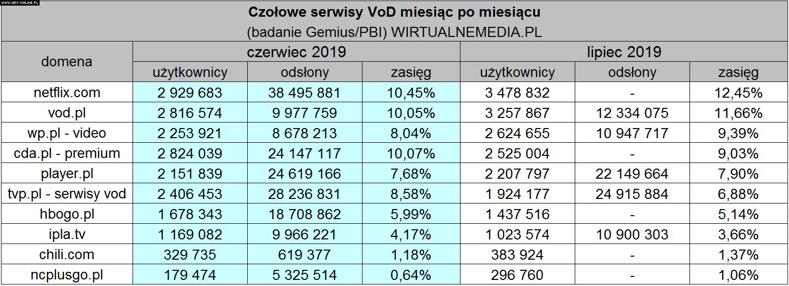 Światowy rynek VoD przygotowuje się na ogromną wojnę pomiędzy konkurencyjnymi dostarczycielami treści, takimi jak Netflix, HBO czy Amazon. W Polsce także dochodzi do sporych przetasowań i zmiany liderów. Wiele z lokalnych serwisów, do których przyzwyczaili się rodacy, może przegrać w przyszłości w starciu z gigantami, tak jak Showmax, który zakończył działalność w ubiegłym roku. Według najnowszych badań wykonanych na zlecenie serwisu Wirtualnemedia.pl przez firmy Gemius/PBI, w ubiegłym miesiącu Netfliksa Polsce odwiedziło 3,478 miliona realnych użytkowników, a więc około 12,45 procent wszystkich internautów w naszym kraju. Na drugim miejscu zestawienia uplasował się vod.pl z 3,25 miliona osób, tym samym serwis ten stracił pozycję lidera, którą zajmował jeszcze w czerwcu. Warto zaznaczyć, że od maja Netflix zwiększył prawie o milion liczbę miesięcznych odwiedzin, tak więc wyraźnie widoczny jest trend wzrostowy.