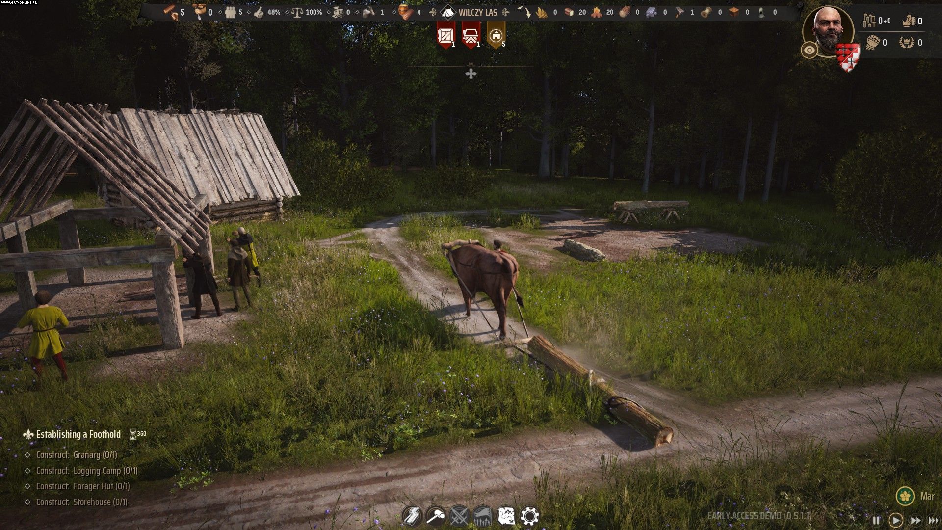 Nic dziwnego zatem, że rozbudowa naszej osady uderza prawdziwością, redukując gatunkową umowność czynności wykonywanych przez naszych podopiecznych do koniecznego minimum. Potrzeba materiałów do budowy? Jeden z osadników zaprzęga woła i ciągnie owe materiały na miejsce. Jeden po drugim. W międzyczasie pozostali, deska po desce i belka po belce rozpoczynają prace nad nową konstrukcją. Ktoś inny karczuje las, uważając przy tym, by spadające drzewo nie wgniotło go w ziemię.