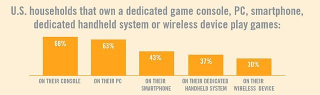 Rzecz jasna palmę pierwszeństwa dumnie trzymają konsole stacjonarne – korzysta z nich 68% amerykańskich graczy. Jednak PC nie zostaje daleko w tyle, bowiem aż 63% grających zasiada przed monitorami komputerów osobistych. Różnica 5 punktów procentowych pomiędzy dwoma kategoriami wskazuje, że konsole nie wyprzedziły pecetów tak bardzo, jak skłonni są to przedstawiać liczni wydawcy. Ponadto komputery wciąż dominują nad rosnącymi w siłę smartfonami, których do grania używa 43% respondentów (38% w 2011 roku). Kolejną pozycję okupują handheldy – na konsolach przenośnych gra 37% spośród zapytanych Amerykanów. One również odnotowały wzrost popularności w porównaniu z rokiem wcześniejszym (35%). Podobnie rzecz się ma z pozostałymi urządzeniami bezprzewodowymi (wzrost z 26 do 30%).