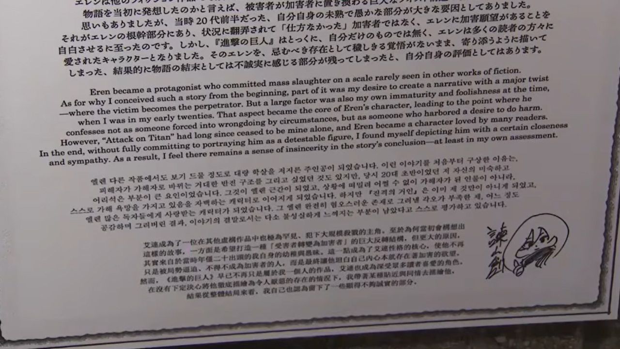 Po raz pierwszy od 3 lat odświeżono wystawę w muzeum Attack on Titan w mieście Hita. Pojawiło się tam 26 nowych tabliczek, a na jednej z nich znalazł się komentarz Isayamy, który okazuje się być swoim największym krytykiem i zarzuca sobie, że w finale jego największego dzieła znalazła się „nuta nieszczerości”. Twierdzi, że przez to, jak pod wpływem popularności serii nieco zmienił swoje podejście do Erena, pod koniec serii przedstawiając go z pewną dozą sympatii, wkradła się tam nuta nieszczerości.