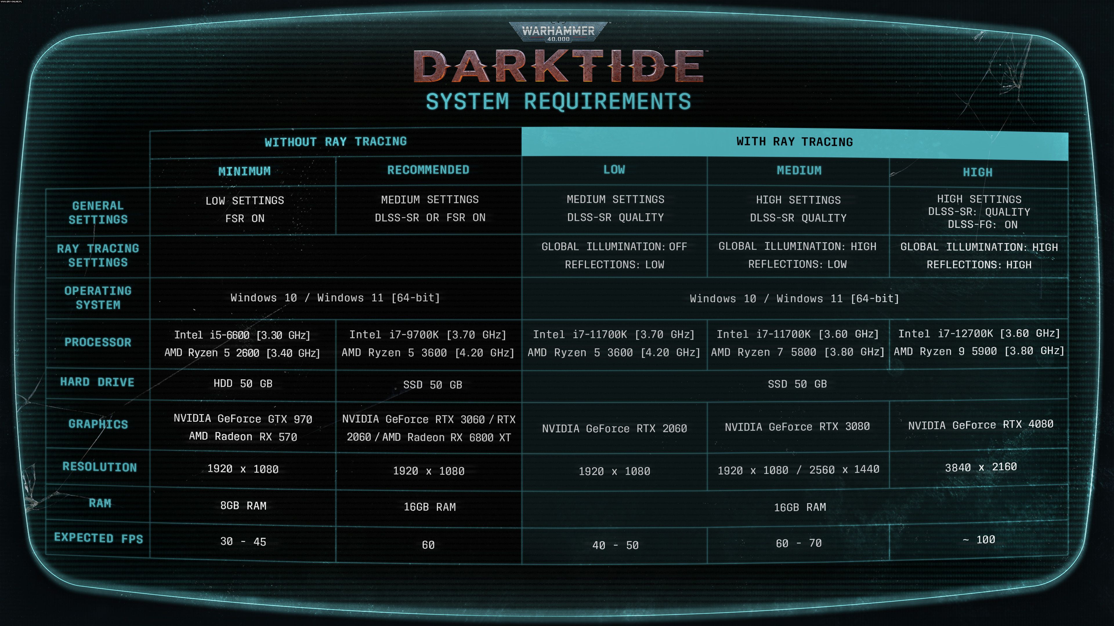 Warhammer 40,000: Darktide jest coraz bliżej premiery (nastąpi 30 listopada), twórcy podzielili się więc garścią przydatnych technicznych informacji. Na swoim oficjalnym blogu omówili w bardzo szczegółowy sposób wymagania sprzętowe – zarówno dla osób chcących skorzystać z ray tracingu, jak i dla tych, których zadowoli granie bez tej technologii.