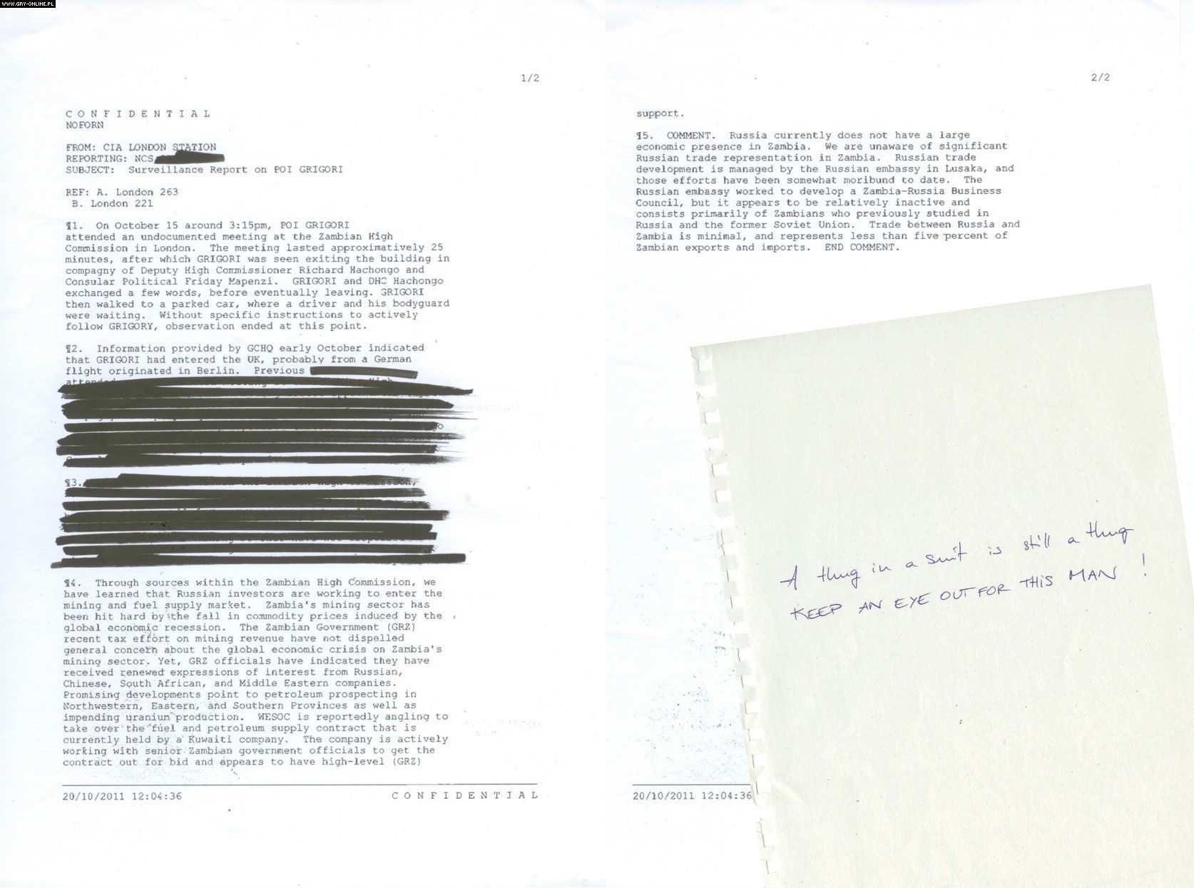 Wewnątrz paczki znaleźliśmy fotografię oraz dwa kawałki papieru. Jeden to odręcznie napisana notatka, by wystrzegać się człowieka w garniturze - wszak dobrze ubrany zbir wciąż jest zbirem, a jak on wygląda możecie zobaczyć na załączonej fotografii. Drugi papier to tajemniczy dokument przesłany przez CIA na temat poczynań osobnika nazwanego Grigori. Dodatkową informacją był zapisany adres strony www, która okazała się być serwisem o nazwie Warmongers Inc. (Podżegacze Wojenni Inc.). Prawdziwa zabawa dla miłośników teorii spiskowych, ARG i kampanii wirusowych rozpoczyna się właśnie tutaj.