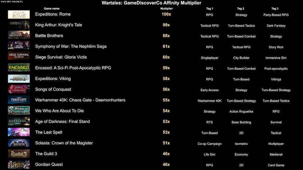 Niemniej GameDiscoverCo postanowił sprawdzić, czy gracze Battle Brothers rzeczywiście są tak bardzo zainteresowani Wartales, jak można by przypuszczać. W tym celu redakcja zmierzyła coś, co określa jako „powiązanie” (Affinity).