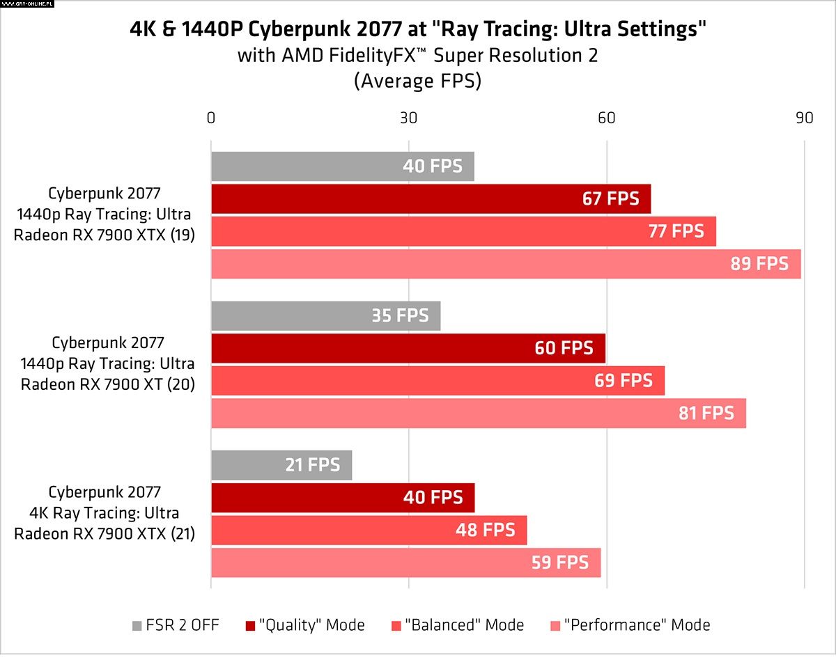Oprócz gier przedstawionych na powyższych grafikach AMD przetestowało również wydajność Cyberpunka 2077 z FSR 2 na ustawieniach Ultra i z włączonym ray tracingiem. Tytuł stworzony przez CD Projekt RED w dalszym ciągu potrafi być bardzo wymagający, co udowodniły testy bez włączonego upscalingu, gdzie gra działała w 21 klatkach na sekundę.