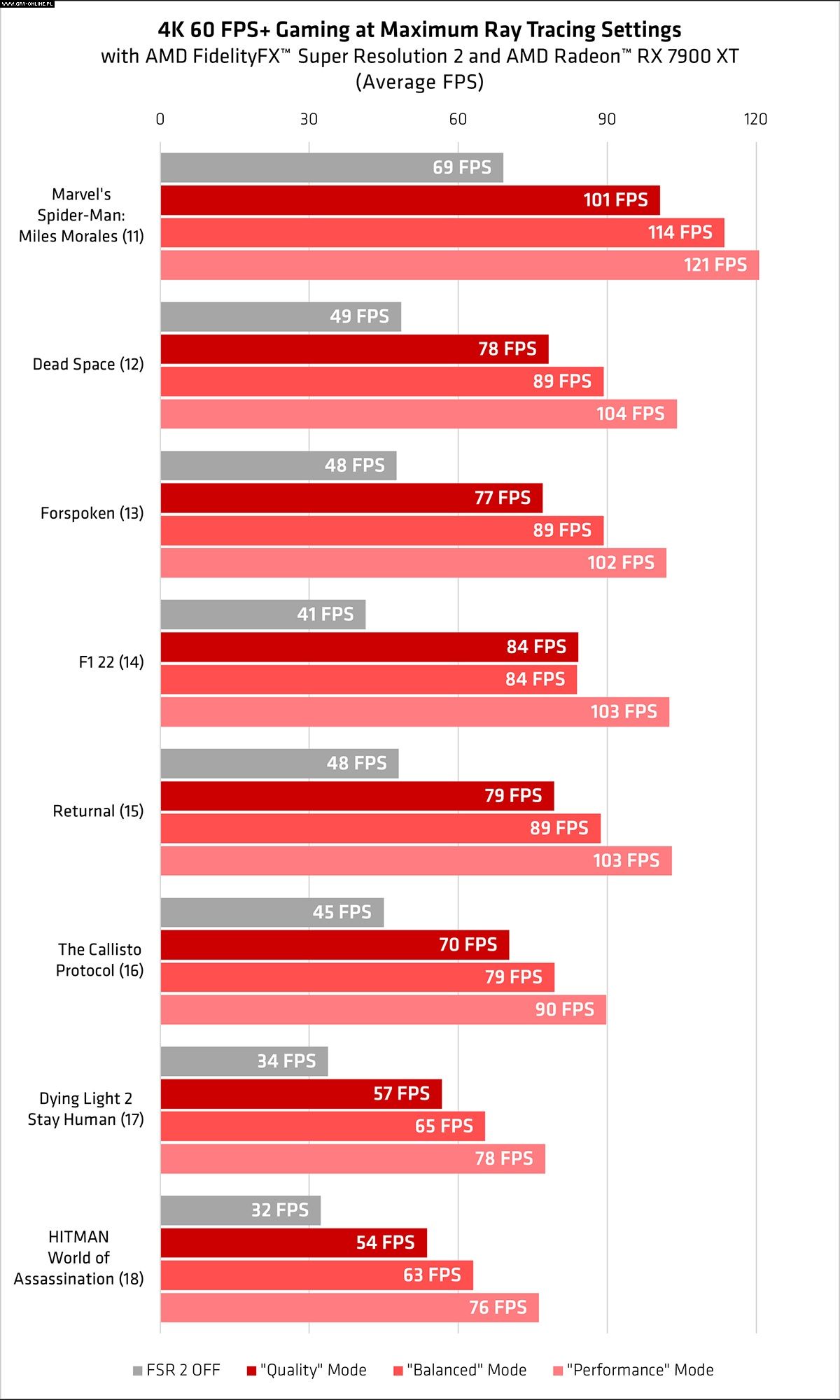 Na wykorzystanej przez „Czerwonych” platformie testowej tylko jeden tytuł przekroczył barierę 60 klatek na sekundę na najwyższych detalach i rozdzielczości 4K. Sytuacja poprawiła się jednak po włączeniu FSR w trybie jakości. Zdecydowana większość testowanych przez AMD gier mogła wtedy pochwalić się fps-ami większymi przynajmniej o 30-40 punktów.