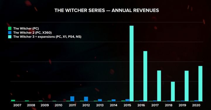 Wiedźmin 3 osiągnął w 2020 roku trzeci najlepszy wynik pod względem ogólnego przychodu. Źródło: CD Projekt