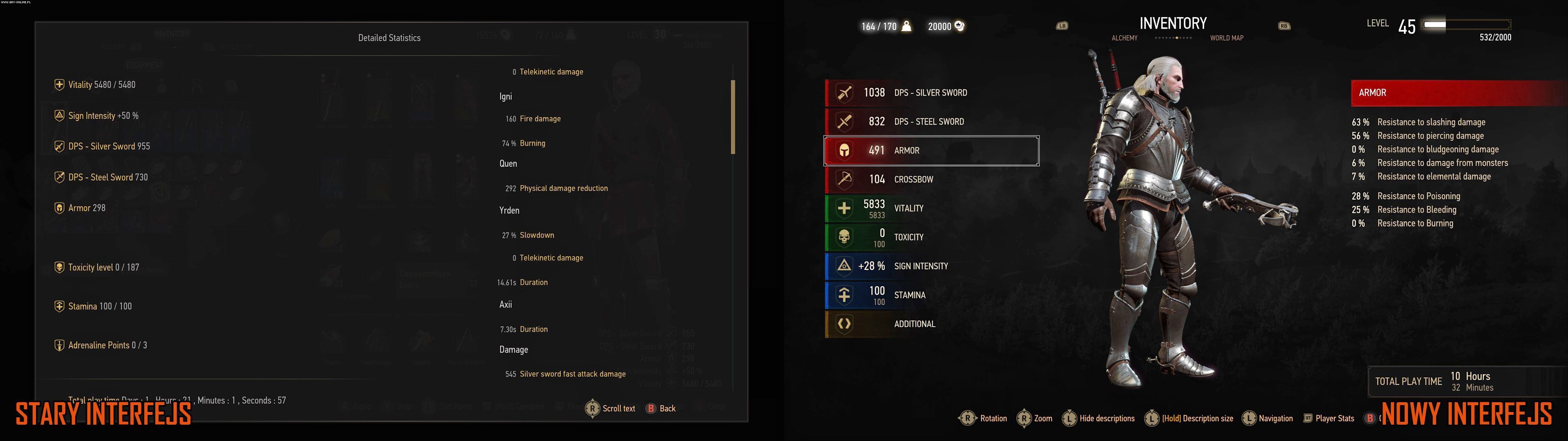 Na szczęście szukanie tych informacji na ekranie szczegółowych statystyk postaci nie będzie tak kłopotliwe jak do tej pory. Już nie trzeba przewijać długiej listy, gdyż dane różnego rodzaju zostały pogrupowane i ujawniają się po podświetleniu odpowiedniej pozycji po lewej stronie. No i przy tym wszystkim znalazło się miejsce na umieszczenie sylwetki Geralta pośrodku.