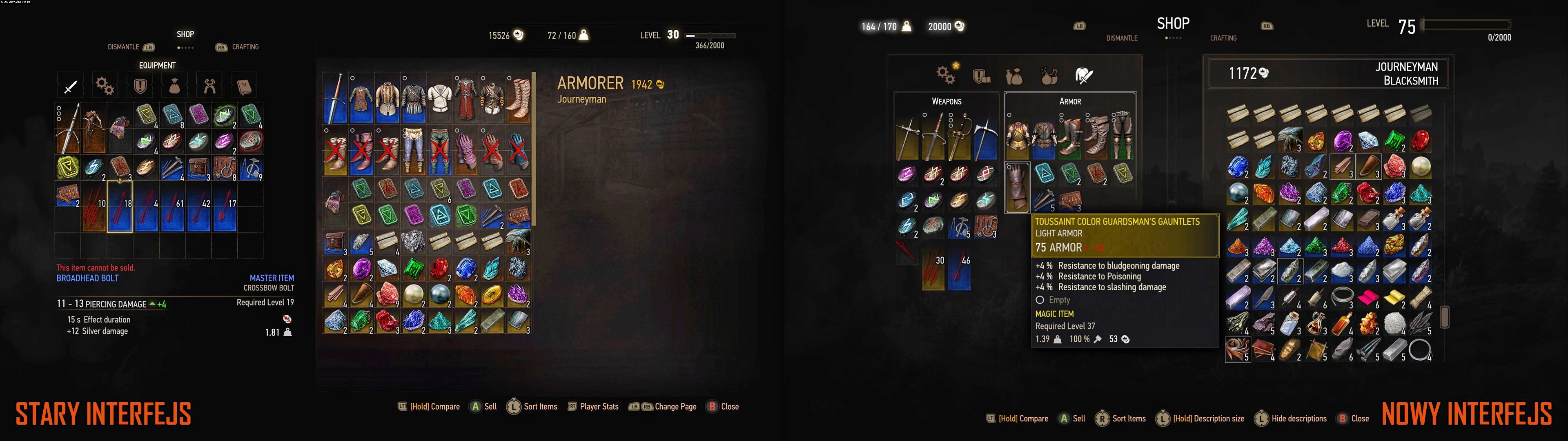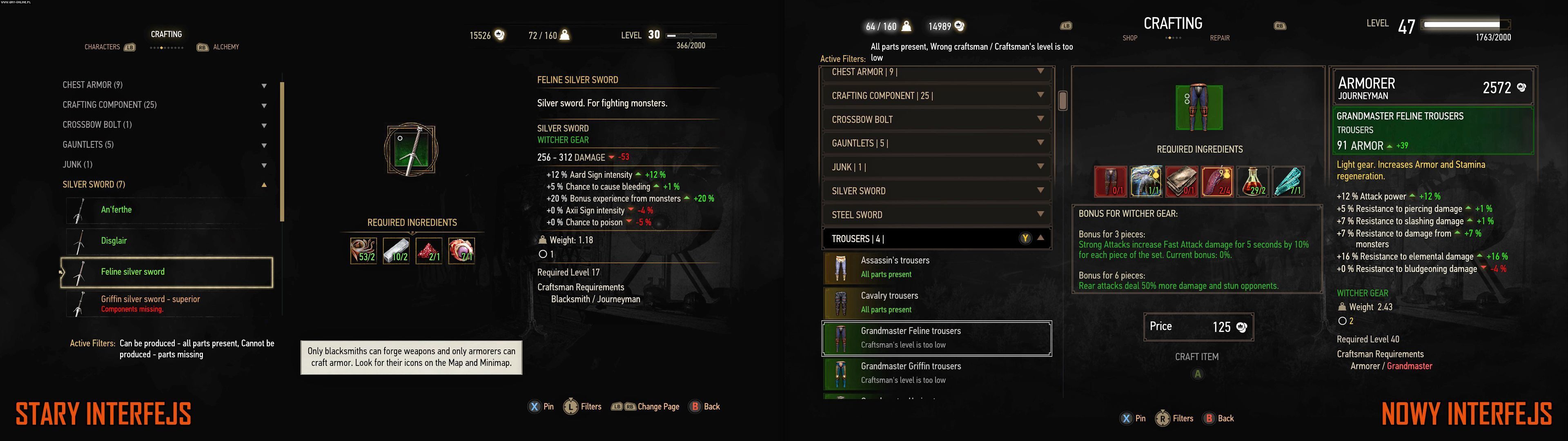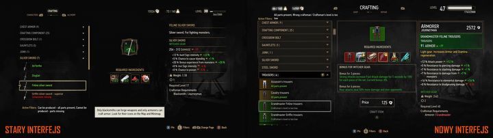 Mniej rewolucyjne są zmiany na ekranie rzemiosła – największą nowością jest chyba dodanie informacji o tym, które składniki i w jakiej ilości można kupić u odwiedzanego w danym momencie rzemieślnika (na ikonkach przedmiotów). Z drugiej strony powyższy screen daje nam wgląd w kolejną mechaniczną innowację – premie za noszenie elementów ekwipunku należących do jednego zestawu. No i możemy przyjrzeć się Spodniom Wiedźmińskiej Szkoły Kota na nowym, arcymistrzowskim poziomie.