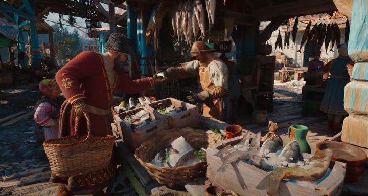 Paradoksalnie świetnie prezentowały się także… ryby. W udostępnionym materiale poświęcono chwilę handlarzowi fauny wodnej, który zachwalał swój towar przed kupującymi. Jego produkty wyróżniały się niezwykle wysokim poziomem graficznym – zarówno pod względem tekstur, jak i detali. Zwykle tego typu elementy są graficznie niedopracowane — z powodu ich marginalnego znaczenia lub w celu oszczędności zasobów. A nie ukrywam, że jestem graczem, który, przemierzając ulice miast, lubi zwracać uwagę na takie detale otoczenia.