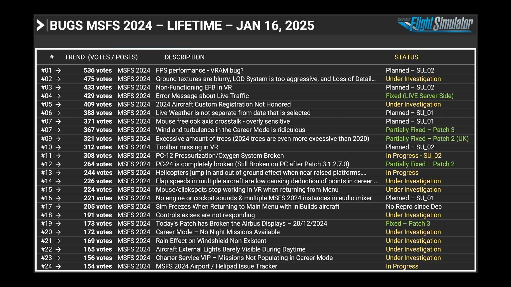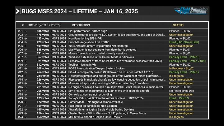 Ostatni raport deweloperów na temat błędów w Microsoft Flight Simulator 2024 wzburzył fanów gry korzystających z gogli VR. Pokazał on, że kluczowe błędy w trybie VR, jak brak belki z szybkim dostępem do opcji oraz niemożność obsługi tabletu EFB, zostaną naprawione dopiero w Sim Update 2, czyli najwcześniej w czerwcu! Również wtedy ma być usunięty istotny bug z zapychaniem się pamięci VRAM, który powoduje ogromne spadki w fps-ach. Na pierwszy duży patch, czyli Sim Update 1, poczekamy do marca, o ile nie będzie żadnych opóźnień.