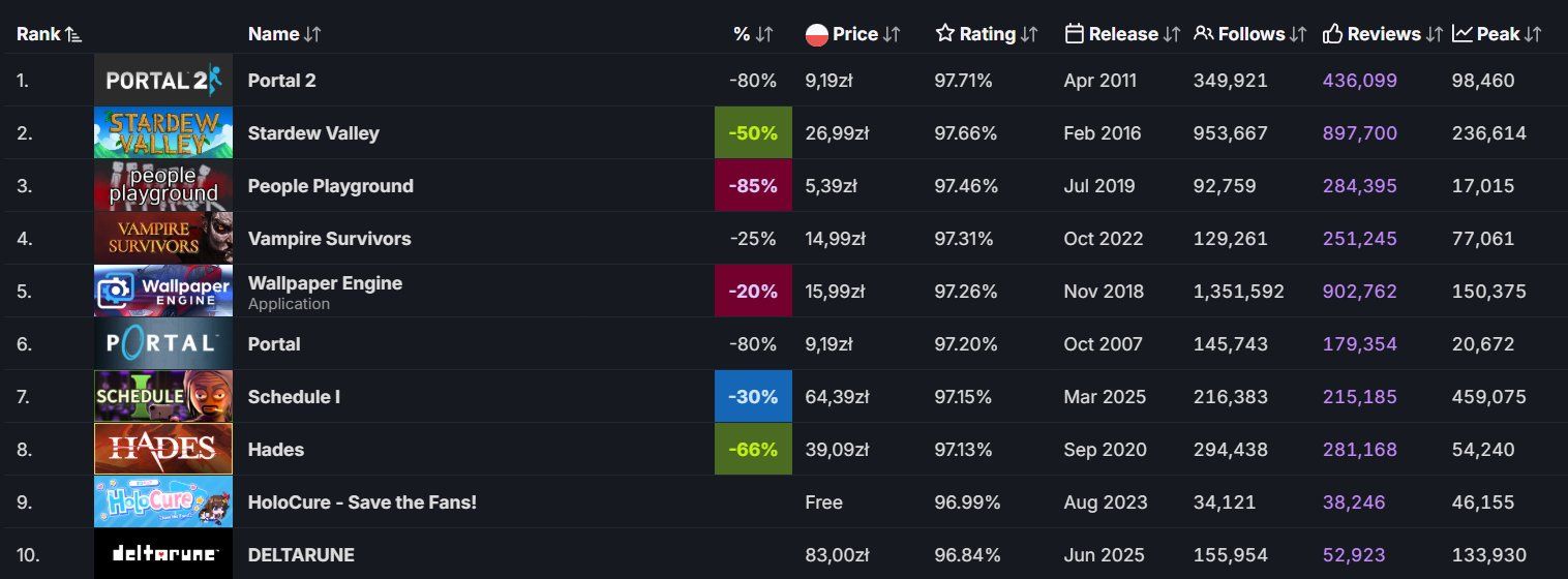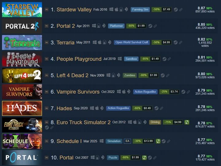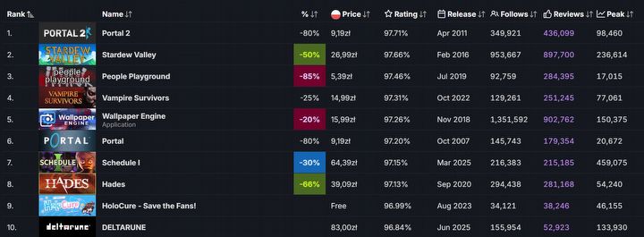 Warto wspomnieć, że ranking Steam 250 prezentuje się nieco inaczej w serwisie SteamDB, który opiera go na własnym algorytmie i nie przywiązuje tak dużej wagi do liczby recenzji. Stardew Valley zajmuje w nim drugie miejsce, za grą Portal 2, a przed nietypowym symulatorem People Playground.