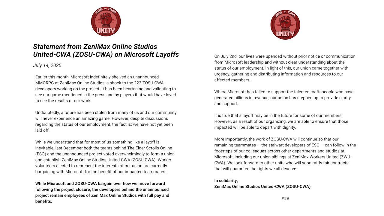 Część z tych informacji na temat kulisów produkcji i anulowania nowej gry była nieoficjalna. Jednakże teraz głos zabrało ZeniMax Online Studios United (ZOSU-CWA; via serwis IGN) – jeden ze związów zawodowych studia skupiający 461 pracowników, powołany w grudniu 2024 roku. Ci opublikowali długie oświadczenie, w którym odnieśli się do kwestii zwolnień.