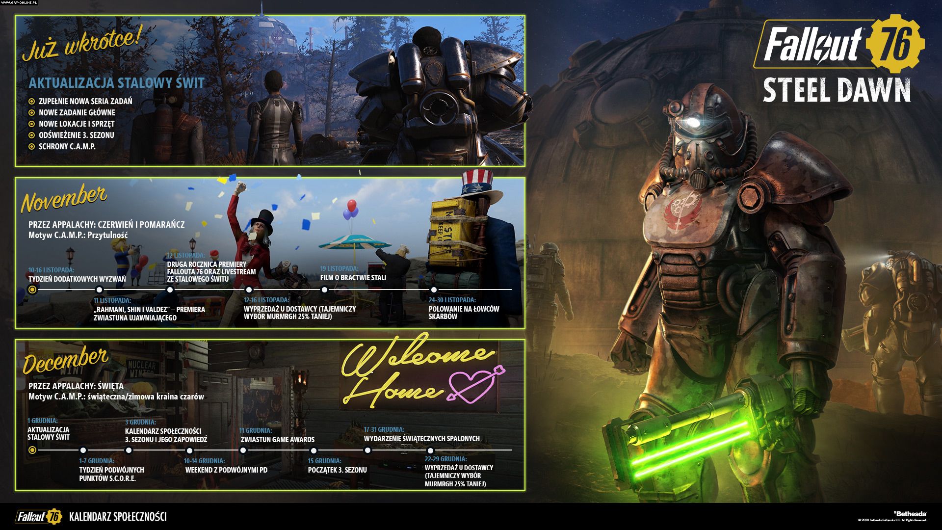 Więcej informacji na temat Stalowego Świtu znajdziecie na tej stronie. Umieszczono tam także infografikę prezentującą plany związane z Falloutem 76 do końca roku (do zobaczenia powyżej). Jak doskonale na niej widać, obecnie trwa świętowanie drugiej rocznicy premiery gry. W ramach tego do 17 listopada gracze mogą gromadzić tzw. punkty S.C.O.R.E, szybciej awansować i zdobywać nagrody, a także brać udział w dodatkowych wyzwaniach. Ponadto od dziś od godziny 18:00 do 16 listopada również do godziny 18:00 pojawi się opcja zakupienia legendarnego uzbrojenia i pancerzy od Murmrgh z 25-procentowym rabatem.