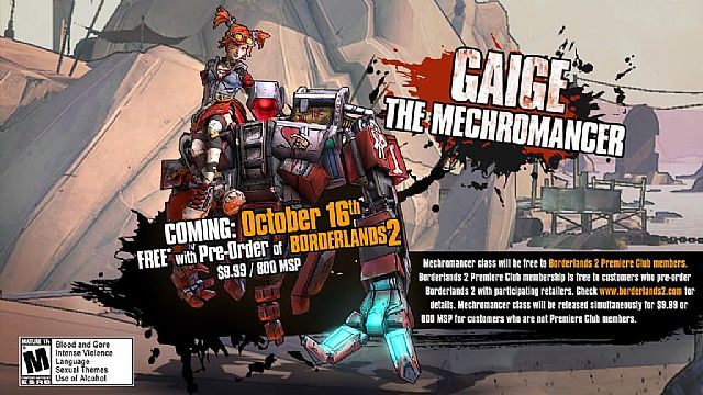 Studio Gearbox Software ujawniło nową klasę postaci do gry Borderlands 2, która zostanie udostępniona po premierze. Gaige the Mechromancer to kobieta widoczna na poniższym zdjęciu, która w trakcie walki najwyraźniej będzie korzystać z potężnego mecha. Bohaterka zostanie udostępniona 16 października za darmo dla członków usługi Premiere Club lub nabywców pre-orderów u wybranych sprzedawców. Pozostali zapłacą równowartość 9,99 dolarów (ok. 32 złotych bez podatku VAT) lub 800 punktów Microsoftu.