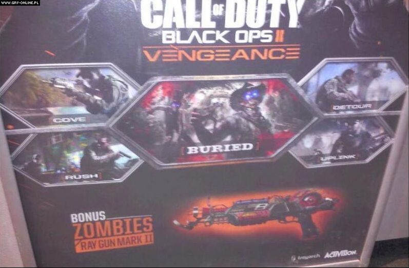 W serwisie No Shit Shurlock pojawiło się zdjęcie plakatu zapowiadającego kolejny dodatek DLC do gry Call of Duty: Black Ops II. Rozszerzenie miałoby nazywać się Vengeance i zawierać cztery mapy (Detour, Uplink, Rush, Cove) do tradycyjnych rozgrywek sieciowych oraz jeden etap (Buried) do trybu Zombie. W trakcie obrony przed kolejnymi falami zombiaków będziemy mogli wypróbować nową broń Ray Gun Mark II. Jeśli utrzymana zostanie cena pozostałych dodatków DLC do Call of Duty: Black Ops II, to za Vengeance zapłacimy 14,49 euro (ok. 59 zł) lub 1200 punktów Microsoftu. Nadal musimy jednak czekać na oficjalne potwierdzenie powyższych informacji.