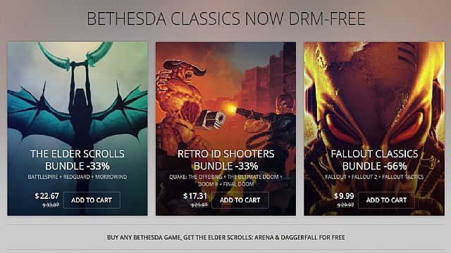 Największa rodzima platforma dystrybucji cyfrowej po raz kolejny (po ubiegłotygodniowym wprowadzeniu kilkunastu klasyków na licencji Dungeons & Dragons) pokaźnie rozszerzyła swoją ofertę. GOG.com zawarło porozumienie z firmą Bethesda Softworks, na mocy którego do sklepu trafiło paręnaście kultowych gier z serii Fallout, The Elder Scrolls, Doom i Quake (warto wspomnieć, że pierwsza z wymienionych już była niegdyś dostępna, ale musiała zostać wycofana ze sprzedaży kilka lat temu). Aby uświetnić to wydarzenie, zorganizowano promocję umożliwiającą nabycie pakietów z reprezentantami poszczególnych cyklów 33% lub 66% (Fallout) taniej: