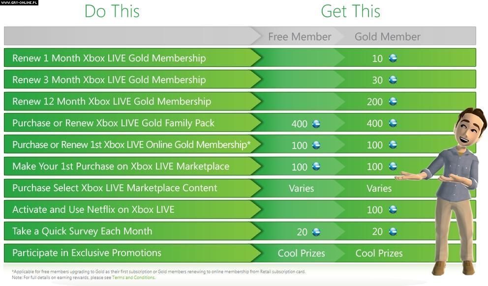 Firma Microsoft uruchomiła program lojalnościowy dla amerykańskich i brytyjskich użytkowników Xbox Live, o którym pisaliśmy po raz pierwszy w listopadzie ubiegłego roku. Uczestnicy będą otrzymywać w jego ramach punkty Microsoftu – wystarczy, że spełnią określone warunki (np. przedłużą abonament lub wezmą udział w comiesięcznej ankiecie). Warto przy tym odnotować, że punkty otrzymywać będą nie tylko posiadacze złotej subskrypcji, ale i użytkownicy Xbox Live Free. Szczegółową rozpiskę programu Xbox Live Rewards znajdziecie w tym miejscu.