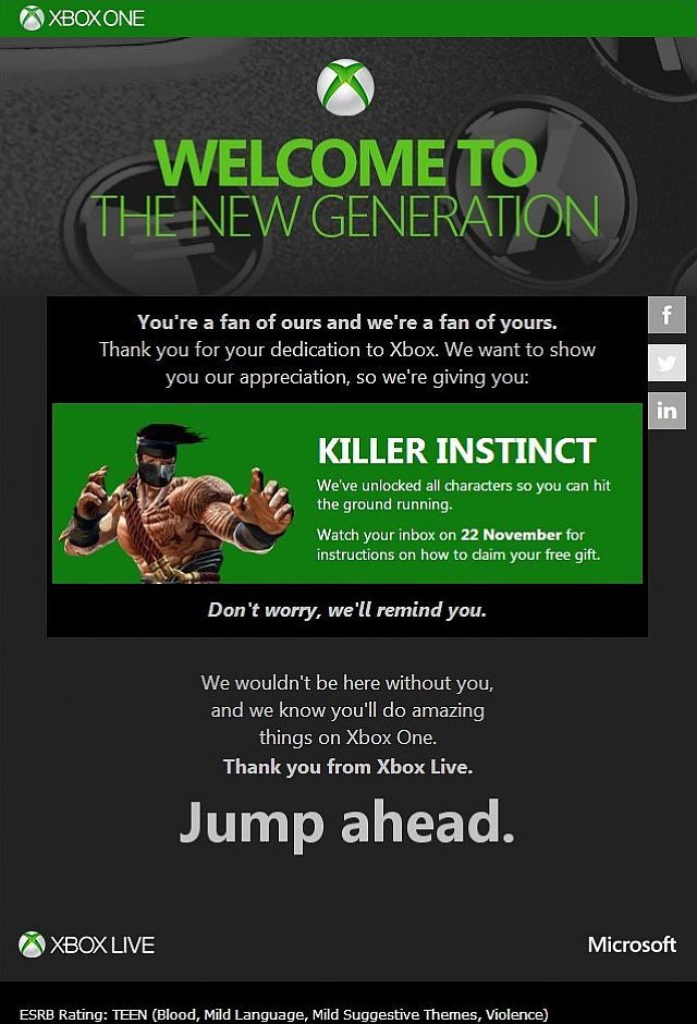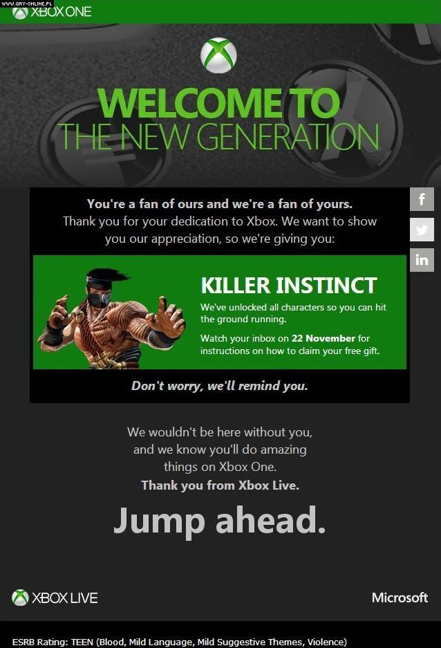 Część użytkowników Xbox Live otrzymała wiadomość e-mail od firmy Microsoft, informującą o bezpłatnym dostępie do wszystkich postaci występujących w bijatyce Killer Instinct na Xboksa One. Produkcja studia Double Helix będzie tytułem free to play, w którym za darmo zagramy tylko jednym wojownikiem (Jago). Pozostałe postacie będą sprzedawane w systemie mikropłatności, a pakiet wszystkich bohaterów ma kosztować 19,99 dolarów (ok. 62 zł bez podatku VAT). Podstawowym kryterium przy rozsyłaniu wspomnianych wiadomości e-mail był wiek gracza oraz zdobyta przez niego liczba punktów Gamerscore. Killer Instinct zadebiutuje 22 listopada bieżącego roku wraz z premierą Xboksa One.