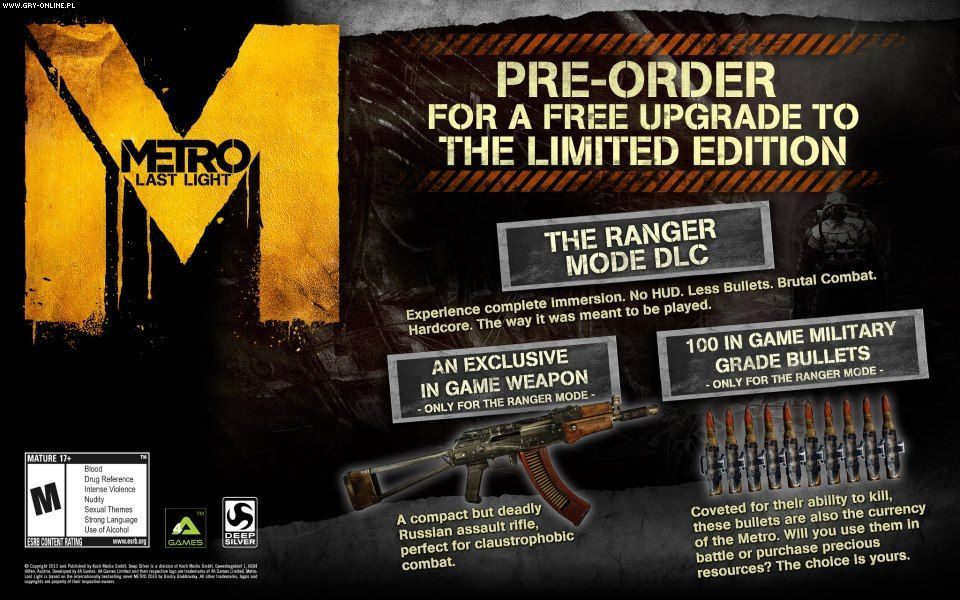 Firma Deep Silver ogłosiła na Facebooku, że gra Metro: Last Light w Limitowanej Edycji (dostępnej w zamówieniach przedpremierowych) będzie wzbogacona o dodatek DLC Ranger Mode. Głównym atutem rozszerzenia będzie tytułowy tryb Ranger Mode, eliminujący interfejs (tzw. HUD), minimalizujący ilość dostępnej amunicji oraz utrudniający walkę z przeciwnikami. Oprócz tego otrzymamy ekskluzywny karabin oraz 100 specjalnych naboi, pełniących funkcję waluty w grze. DLC będzie można zakupić oddzielnie od dnia premiery Metro: Last Light (17 maja w Europie) na PC, PlayStation 3 oraz Xboksie 360.
