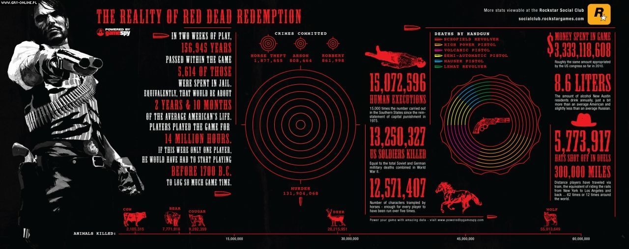 Rockstar Games opublikowało w Sieci szereg statystyk związanych z Red Dead Redemption (X360, PS3), pozyskanych dzięki systemowi GameSpy. Możemy się z nich dowiedzieć, że posiadacze spędzili w świecie gry ponad 150 milionów godzin, wypijając średnio 8,6 litra alkoholu oraz zabijając ponad 55 milionów wilków. Pozostałe dane znajdziecie na zamieszczonej poniżej grafice: