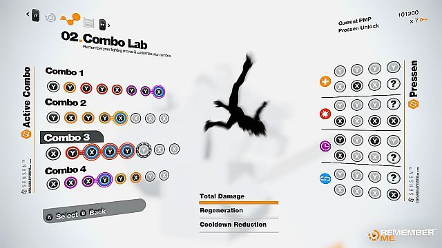 Jean-Maxime Moris ze studia Dontnod Entertainment zaprezentował na imprezie Eurogamer Expo system walki w grze Remember Me. Okazuje się, że dostaniemy ogromne możliwości modyfikowania serii ciosów wyprowadzanych przez główną bohaterkę. W wyniku aplikowanych zmian w opcji Combo Lab będziemy mogli stworzyć nawet 50 tysięcy różnych kombosów, choć w danej chwili aktywne będą tylko cztery. W trakcie zabawy odblokujemy coraz więcej ruchów bohaterki, określanych jako Pressens. Otrzymamy do dyspozycji cztery rodzaje Pressensów: Regen (odnawiające energię życiową), Power (zadające dodatkowe obrażenia), Cooldown oraz Chain. Więcej szczegółów na temat systemu walki znajdziecie w artykule serwisu Eurogamer.