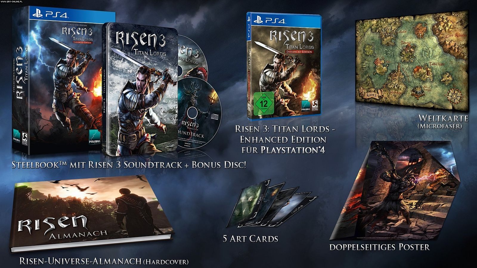 Studio Piranha Bytes wprowadziło do dystrybucji edycję kolekcjonerską gry Risen 3: Titan Lords – Enhanced Edition, czyli odświeżonego wydania trzeciej odsłony RPG-owej serii Risen, opracowanego z myślą o konsoli PlayStation 4. Ekskluzywne wydanie zawiera steelbook ze ścieżką dźwiękową i jeszcze jedną, „bonusową” płytą, almanach wiedzy o świecie gry w twardej oprawie, pięć kart z grafikami koncepcyjnymi, wielkoformatowy plakat oraz mapę świata (poniżej możecie zobaczyć wizualizację pakietu). Niestety, wątpliwe jest, by rodzimy dystrybutor, firma Cenega, ściągnął „kolekcjonerkę” do Polski – na liście terytoriów, w których zostanie ona udostępniona, wymieniono tylko Wielką Brytanię, Niemcy, Austrię, Szwajcarię, Włochy, Francję, Hiszpanię i kraje skandynawskie. Sugerowana cena tego wydania na Zachodzie wynosi 49,99 euro (w przeliczeniu ok. 210 zł). Risen 3 w wersji na PS4 zadebiutuje na całym świecie już jutro.
