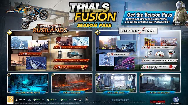29 czerwca w cyfrowej dystrybucji zadebiutuje pierwszy z planowanych sześciu dodatków DLC do gry Trials Fusion. Rozszerzenie o nazwie Riders of the Rustlands wprowadzi dziesięć nowych tras, osiemnaście wyzwań, pięć Trofeów oraz kolejne obiekty do edytora torów. DLC będzie można nabyć za 3,99 funtów (ok. 20 zł). Alternatywą jest wykupienie przepustki Season Pass za 15,99 funtów (ok. 83 zł), uprawniającej do pobrania w przyszłości wszystkich dodatków. Latem do sprzedaży trafi DLC Empire of the Sky o podobnej zawartości do poprzedniego. Szczegóły znajdziecie na poniższej grafice, gdzie potwierdzono również tytuły kolejnych rozszerzeń.