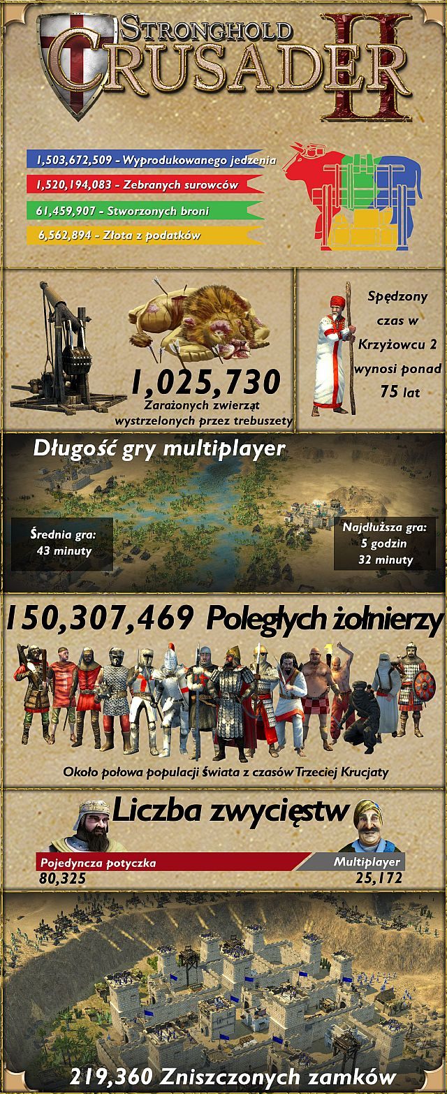 Firefly Studios przygotowało ciekawą infografikę podsumowującą pierwszy tydzień aktywności w grze Twierdza: Krzyżowiec II. Kontynuacja znanej serii gier strategicznych ukazała się 23 września 2014 zbierając pochlebne opinie w mediach i wśród graczy – u nas drugi Krzyżowiec otrzymał notę 8,5/10.