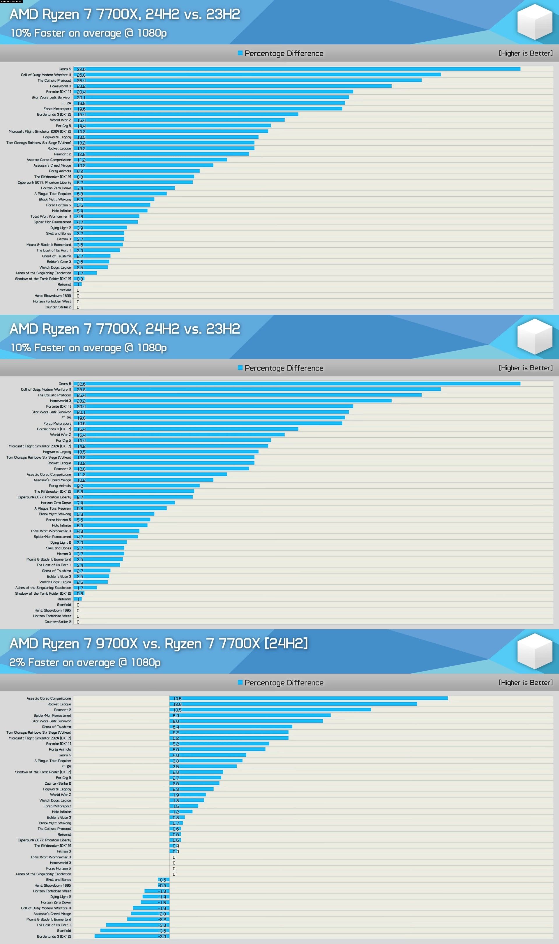 Natomiast przy Call of Duty: Modern Warfare 3 i Assassin's Creed Mirage obecna wersja Windowsa 11 23H2 daje przewagę 9700X, ale zmieni się to wraz z aktualizacją 24H2, co pokazały testy Hardware Unboxed. Wspomniane gry to nie jedyne wyjątki – w przypadku innych tytułów, takich jak Skull and Bones lub Hogwarts Legacy, wyniki procesorów zamieniały się miejscami i w jednych grach wydajniejszy był 7700X, a w innych 9700X.