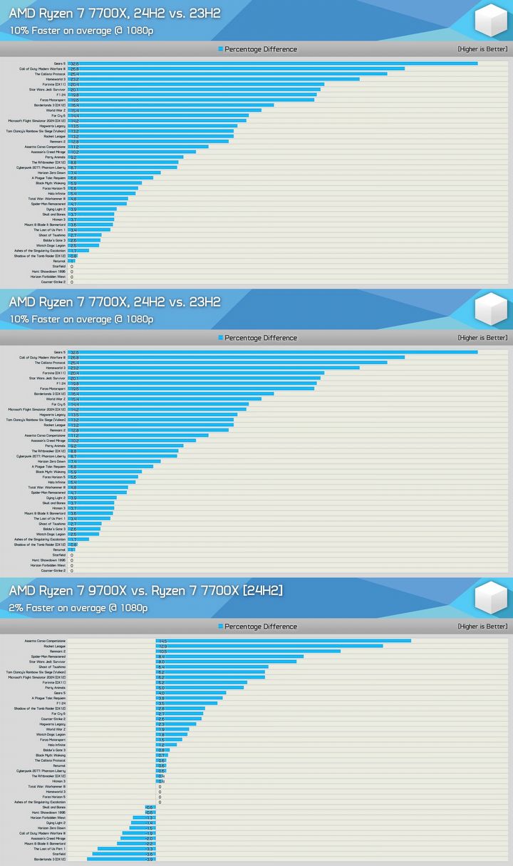 Ostatecznie to Ryzen 7 9700X okazał się być lepszym procesorem, ale tylko o 2% (przypomnijmy, że zeszłoroczne doniesienia wspominały nawet o różnicy wynoszącej nawet 30%). Faktem jest jednak, że Windows 11 w wersji 24H2 podnosi wydajność nowych procesorów o nawet dwucyfrowe wartości. Testy przeprowadzono na grach w rozdzielczości 1080p.