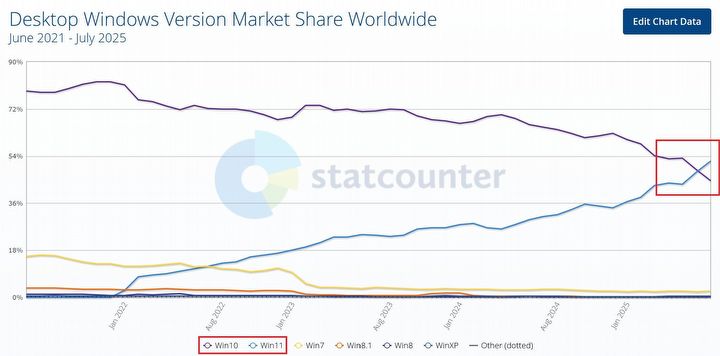 Udział w rynku wersji systemu Windows na komputerach stacjonarnych na całym świecie (czerwiec 2021– lipiec 2025)Źródło: Stat Counter