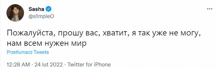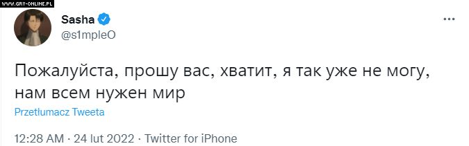 E-sportowiec dodał, że w momencie, w którym pisze owe słowa, jego rodzinne miasto znajduje się pod ostrzałem rosyjskich wojsk. Zawodnicy Natus Vincere obecnie są bezpieczni, znajdują się w Katowicach na turnieju Intel Extreme Masters.