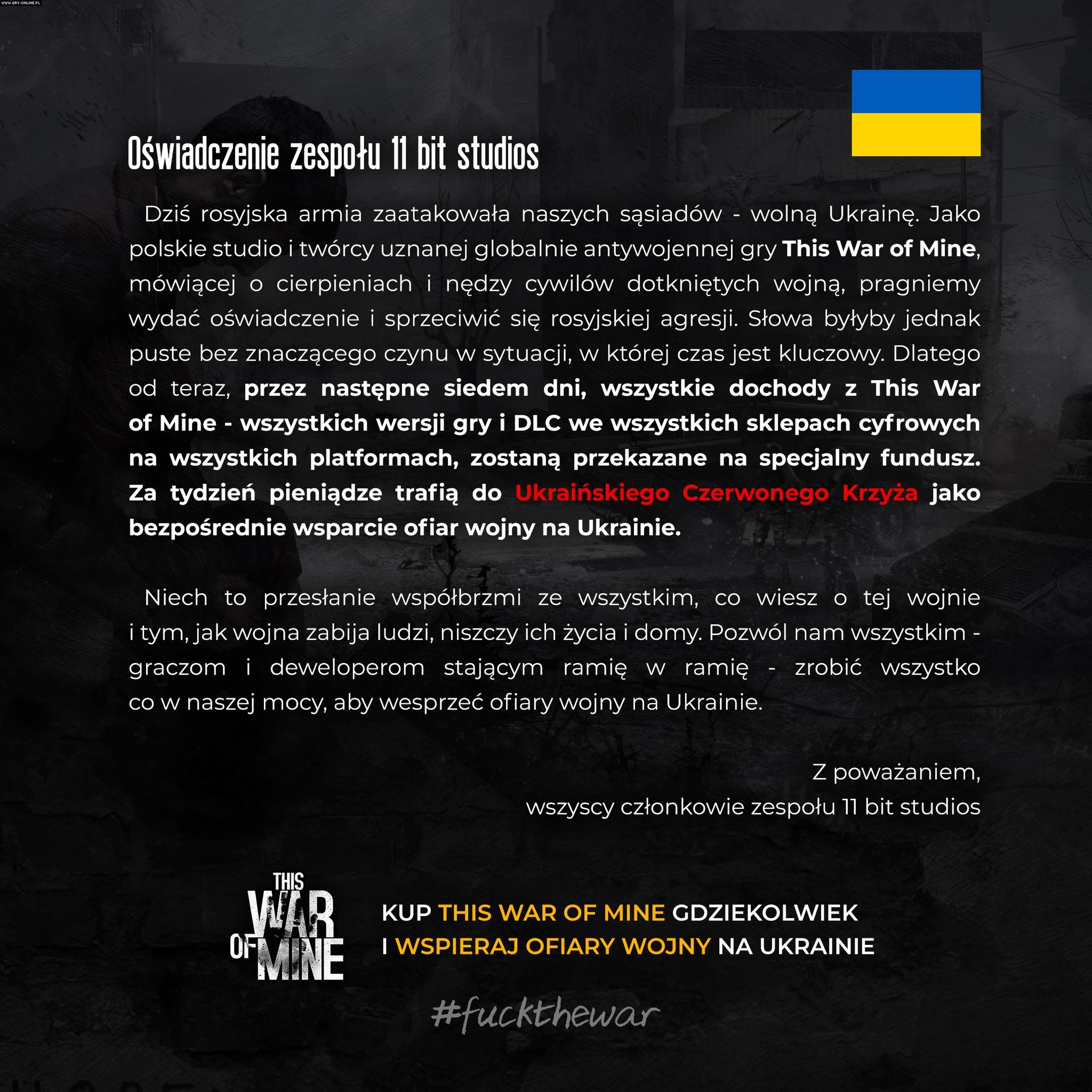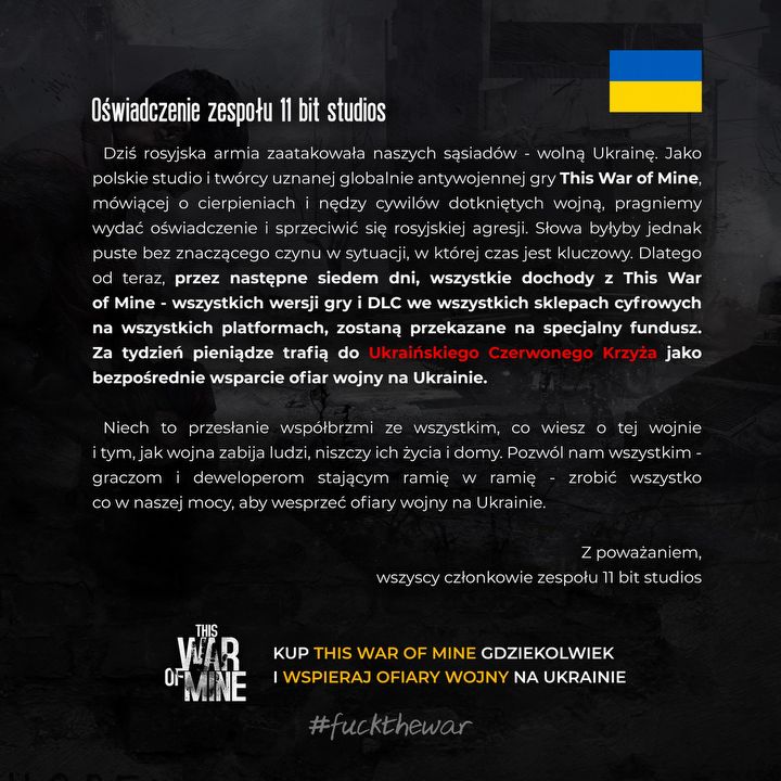 Polskie 11 bit studios, odpowiedzialne za stworzenie This War of Mine, zdecydowało o przekazaniu przychodów ze sprzedaży tej produkcji na rzecz Ukraińskiego Czerwonego Krzyża, by w ten sposób pomagać ofiarom rosyjskiej agresji.