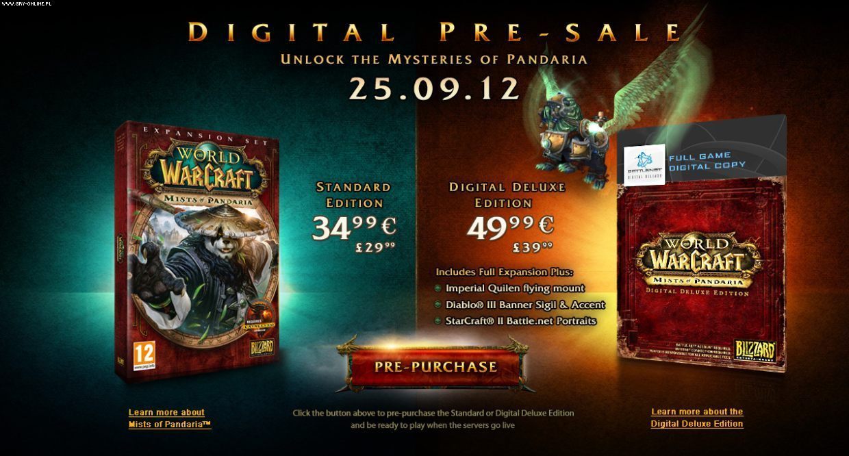 Wersja standardowa zawiera dodatek bez żadnych bonusów i jej cena w przedsprzedaży wynosi 34,99 euro (ok. 145 zł). Z kolei nabywcy cyfrowej wersji deluxe za cenę 49,99 euro (ok. 220 zł) zyskają nowego wierzchowca stylizowanego na uniwersum Pandarenów (Imperial Quilen), dodatkowy znak i akcent na sztandar w Diablo III oraz dwa portrety (Hordy i Sojuszu) do StarCrafta II. Osoby, które zakupią wydanie standardowe Mists of Pandaria, będą mogły je ulepszyć do edycji deluxe w późniejszym czasie za niecałe 15 euro (ok. 60 zł).