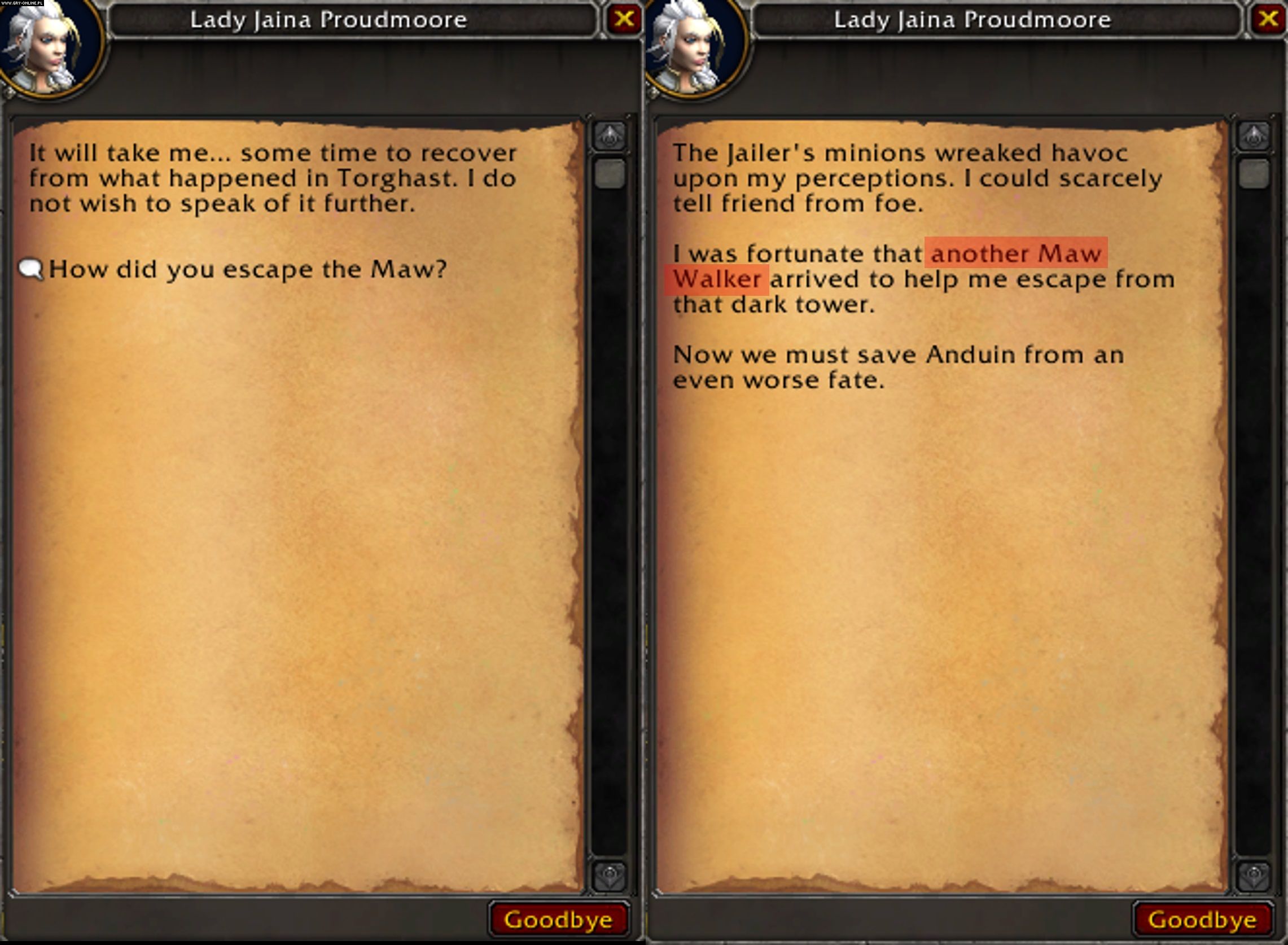 Po krótkim dochodzeniu internauta odkrył, że patch 9.1 po cichu usunął 13 zadań powiązanych z wieżą Torghast, wliczając w to te wymagające odnalezienia w Paszczy (The Maw) Jainy i Thralla. Ta pierwsza postać otrzymała też zmieniony dialog, kiedy rozmawiamy z nią w mieście Oribos: czarodziejka informuje nas, że została uratowana przez innego bohatera (tj. postać gracza). To dowodzi, że nagłe zniknięcie tych questów (które są automatycznie zaznaczane jako ukończone) było celowym zabiegiem deweloperów. Ci zresztą potwierdzili to w odpowiedzi na zgłoszenie Lenestara (via Reddit).