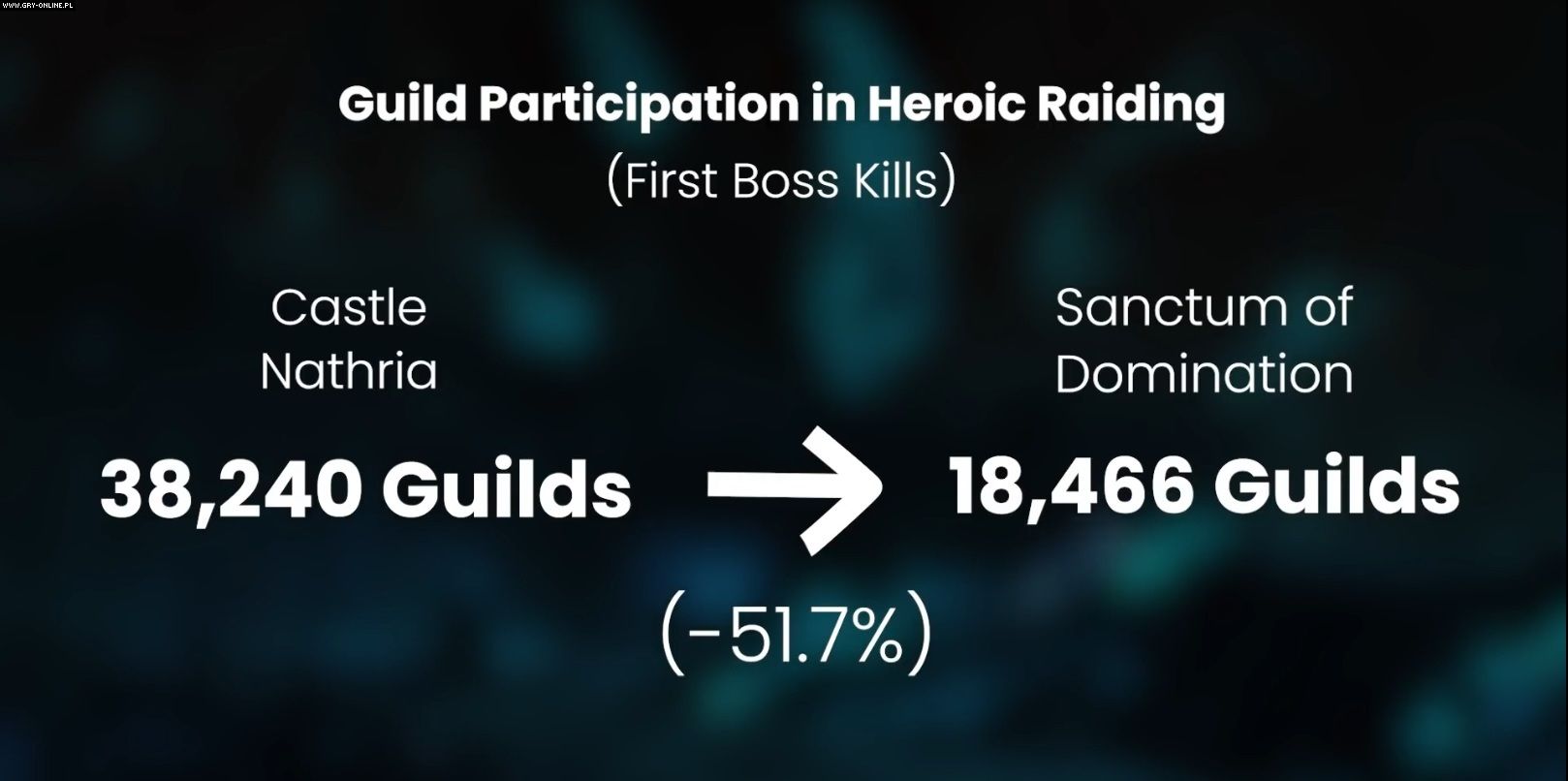 Optymizmem nie napawa też porównanie uczestnictwa gildii w heroicznych wersjach rajdów Castle Nathria i Sanctum of Dominion (-51.7%) oraz w walkach PvP (między 30 sierpnia a 25 października odnotowano o ponad 48% starć mniej; via Xunamte).