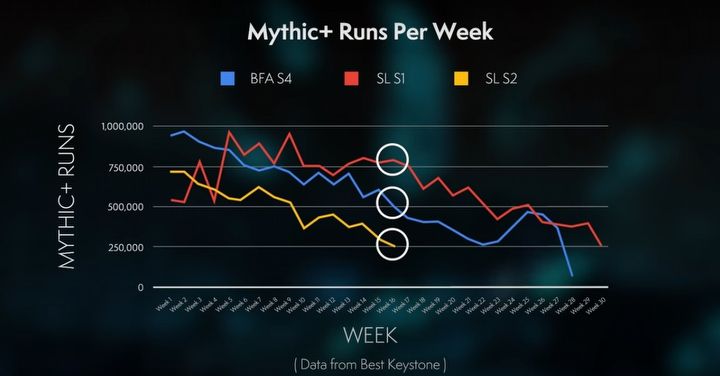 Owszem, na początku lochy na poziomie Mythic+ przyciągnęły liczne grono do czerwcowej aktualizacji Shadowlands. Jednakże drugi sezon dodatku szybko stracił na popularności, zapewne nie bez związku z rozczarowaniem graczy. W efekcie wersja 9.1 dorównała najgorszemu wynikowi podstawowego Shadowlands po zaledwie 16 tygodniach i tym samym wypada po tym czasie gorzej niż ostatni sezon Battle for Azeroth (poprzedniego rozszerzenia) w podobnym okresie. Tego samo BfA, które również nie było opiewane przez fanów w ostatnich miesiącach rozwoju.