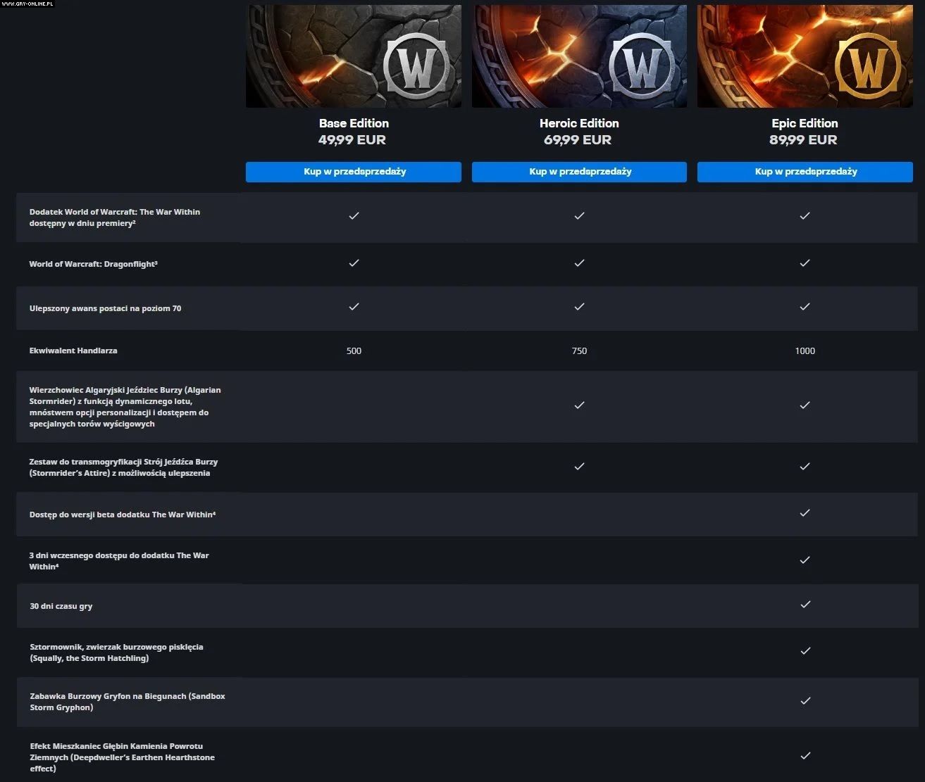 Jak wiecie z naszej piątkowej wiadomości, The War Within – dziesiąty dodatek do World of Warcraft, a zarazem pierwszy z trzech wchodzących w skład Sagi Serca Świata (ang. Worldsoul Saga) – można już „preorderować”, choć jego premiera ma nastąpić dopiero jesienią 2024 roku. Jest on dostępny w trzech wersjach cenowych: standardowej, Heroicznej i Epickiej, kosztujących odpowiednio 49,99 euro (ok. 223 zł), 69,99 euro (ok. 312 zł) i 89,99 euro (ok. 401 zł).