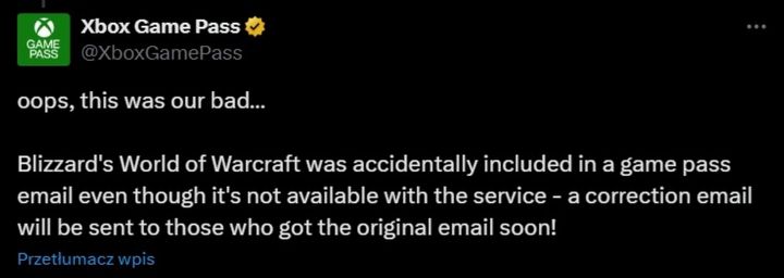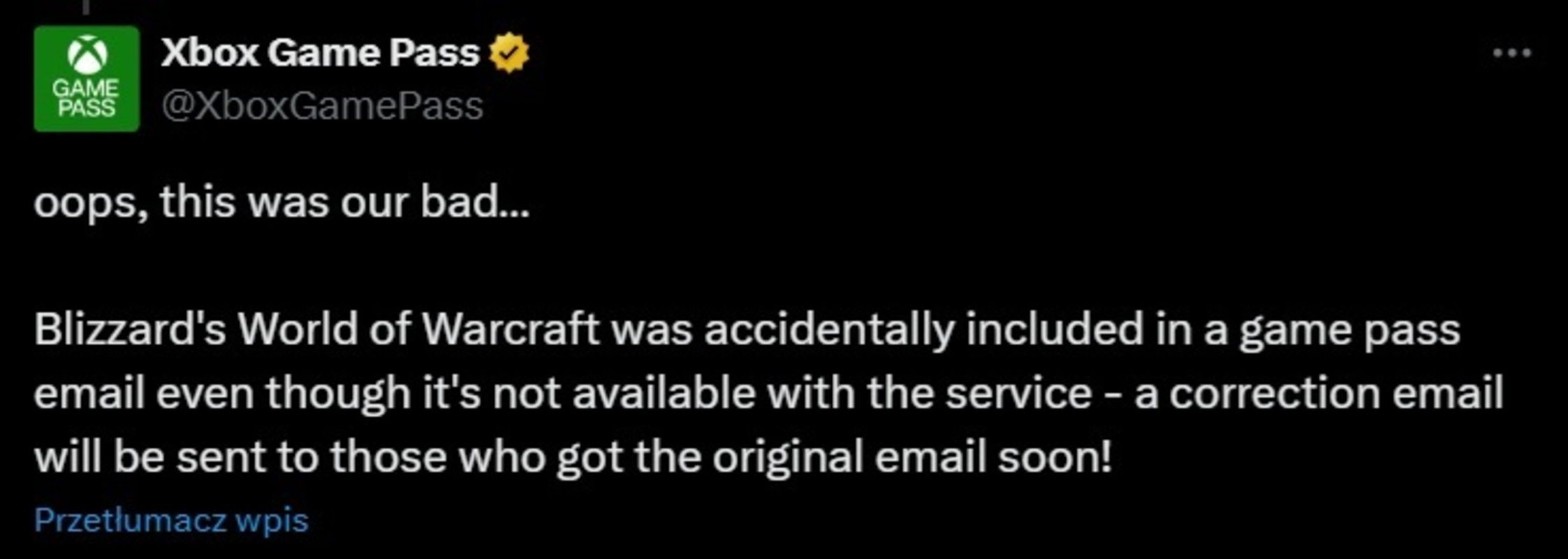 Ups, nasz błąd… World of Warcraft firmy Blizzard został przypadkowo dołączony do e-maila z Game Passem, mimo że nie jest dostępny w ramach usługi – do osób, które otrzymały oryginalną wiadomość, wkrótce zostanie wysłany poprawny e-mail!