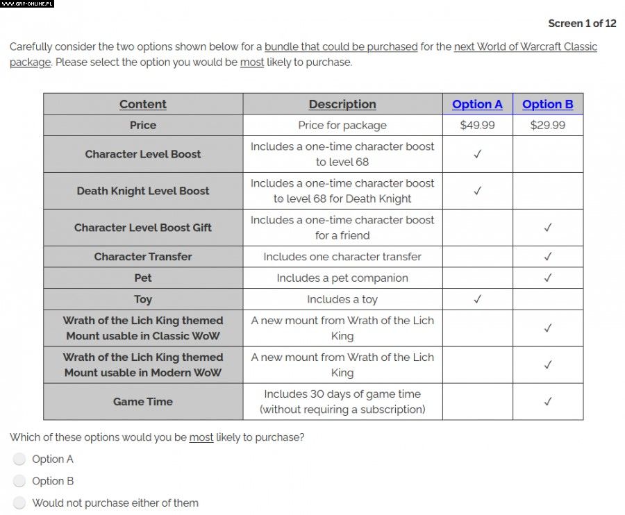 Teraz gracze WoW-a otrzymali kolejną ankietę, tym razem pytającą o preferowaną cenę pakietów powiązanych najpewniej z tym dodatkiem – choć nie wymienili go wprost z nazwy. Wygląda na to, że Blizzard rozważa dwie opcje: zestaw A kosztujący około 128,50 zł (29,99 dolara) oraz zestaw B wyceniany na mniej więcej 214,20 zł (49,99 $).