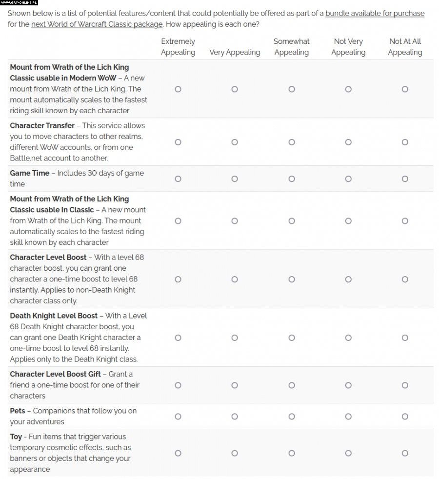 Ankiety rozsyłane graczom przez Blizzarda sugerują, że World of Warcraft: Wrath of the Lich King Classic może zostać niebawem ogłoszony. Deweloperzy pytają w nich m.in. o wycenę pakietów.